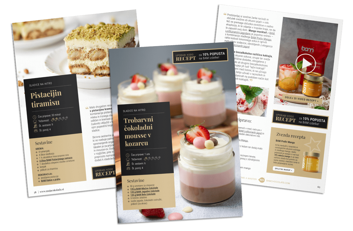 Predstavljamo novo izdajo naše knjige receptov, ki je polna čudovitih čokoladnih sladic in slastnih pregreh. BAM čokolada v tej knjigi igra glavno vlogo, ali vsaj pomembno stransko vlogo, in to v vseh receptih.