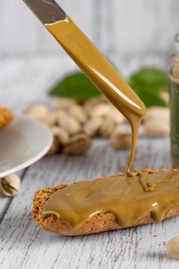 Pasta iz pistacij (50%), trsni sladkor, brezvodno maslo, polnomastno mleko v prahu, emulgator: sončnični lecitin, sol iz Cervie.