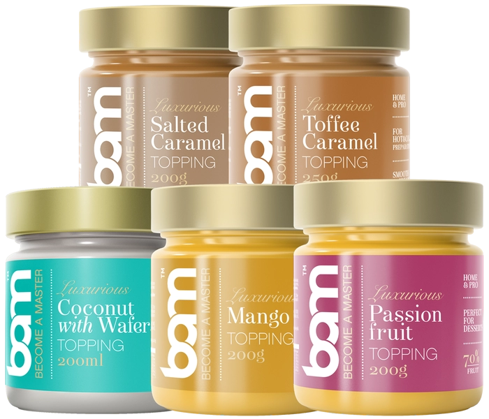 BAMbastičen paket prelivov vsebuje 2 sadna okuse prelivov in tri kremne ter razkošne okuse. Vsi sadni prelivi vsebujejo več kot 70% sadnega deleža. BAM preliv pasijonka, vsebuje 70% sadnega deleža pasijonke, ki je izredno aromatičen sadež prijetno kiselkastega okusa. Kot takšen se z veseljem podruži s sladicami pripravljenimi z BAM belo čokolado in tako razbije njihovo sladkost. Preliv mango, ki je s svojo kremno in sladko strukturo primeren za popestritev vseh vrst sladic, zaradi osvežujočega okusa pa ga brez težav postrežete tudi v osvežilnem koktelju. Sledi BAM preliv Toffee karamela, ki ga lahko uporabite kot polnilo za rogljičke ali piškote, je primeren tako za zamrzovanje kot peko. BAM preliv slana karamela, s svojim razkošnim okusom obogati vse čokoladne sladolede, BAM preliv kokos z vaflji pa je sestavljen iz kreme bele čokolade in kokosa, kjer okus še dodatno popestrijo hrustljavi vaflji. Vsi prelivi so pakirani v priročne kozarčke in so tako primerni tudi kot darilo.