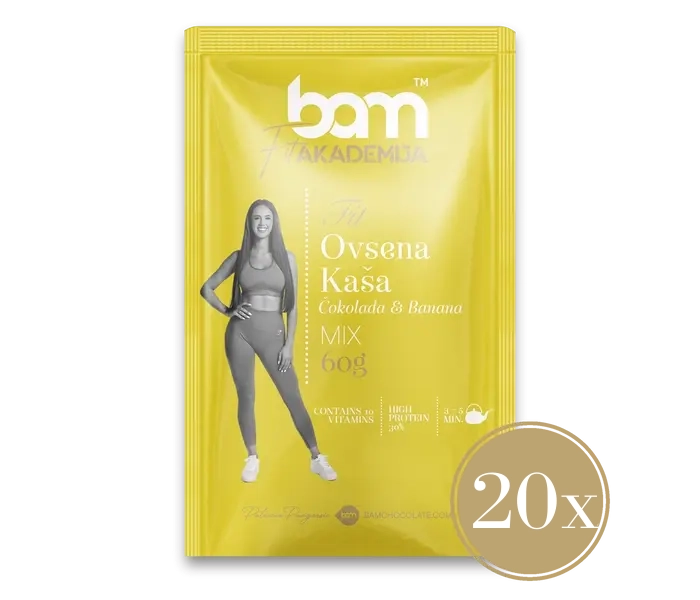 FIT Zajtrk, Čokolada in banana, vsebuje 20 kosov BAM Oatmeal z okusom čokolade in banane. Čokoladno-bananina ovsena kaša z dodatkom proteinov združuje nepremagljivo mešanico intenzivne čokolade in sladkosti banane, ki te bo razvajala v vsakem delu dneva. Z vsakim grižljajem te čaka poplava okusov, ki te bodo navdušili. Prepusti se razkošju čokolade in avtentični sladkobi zrelih banan za bogat in hranljiv zajtrk. Ta proteinsko bogata čokoladno-bananina ovsena kaša, obogatena z vlakninami, predstavlja odlično opcijo za vse, ki želijo združiti zdravje in slasten okus v enem obroku. Omogoča ti zdrav začetek dneva, poln energije.