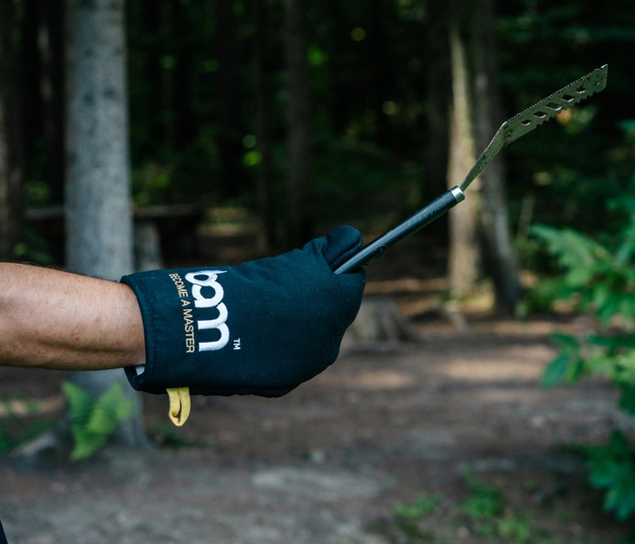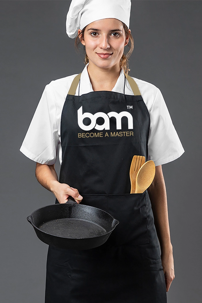 V paketu čakata predpasnik in kuhinjska rokavica za peko. BAM predpasnik lahko z modernim izgledom in logotipom BAM Become A Master, postane vaš novi najljubši kuhinjski pripomoček. Svoj moderni izgled odraža z elegantno črno barvo, kateri se pridružijo še trakovi v baročni zlati barvi, ki vas okoli pasa in vratu poljubno objamejo. V paket se povabi še kuhinjska rokavica za peko, katero smo okrasili z izvezenim BAM logotipom. Rokavica ščiti pred visokimi temparaturami, predpasnik pa zaščiti vaša oblačila med naslednjim ustvarjanjem v kuhinji.
