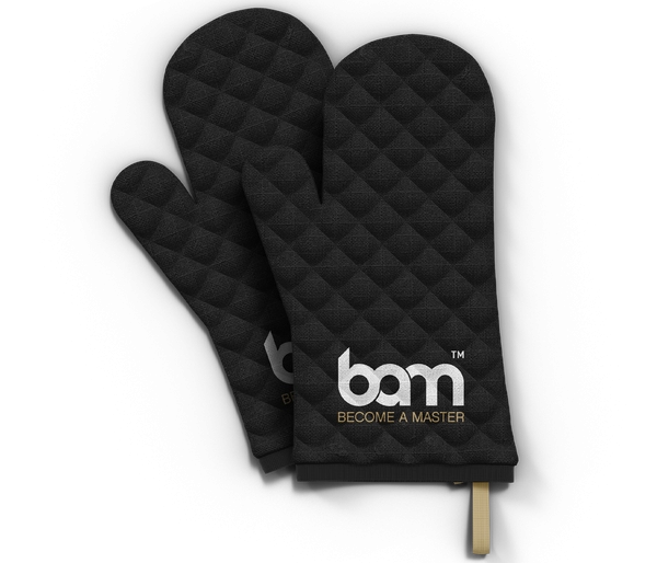 BAM predpasnik in kuhinjsko rokavico za peko smo spravili v bombažno nakupovalno vrečko in tako pripravili paket, ki bo razveselil vsakega slaščičarskega mojstra ali mojstrico. BAM predpasnik z modernim izgledom in logotipom BAM Become A Master, postane najljubši kuhinjski pripomoček. Svoj moderni izgled odraža z elegantno črno barvo, kateri se pridružijo še trakovi v baročni zlati barvi, ki vas lahko okoli pasa in vratu poljubno objamejo. V paket se povabi še toplotno odporna kuhinjska rokavica za peko, na katero smo prav tako dodali izvezen logotip BAM. Predpasnik in rokavica sta sestavljena iz 100% bombaža. Paket je primeren tako za ženske kot za moške slaščičarske ustvarjalce.