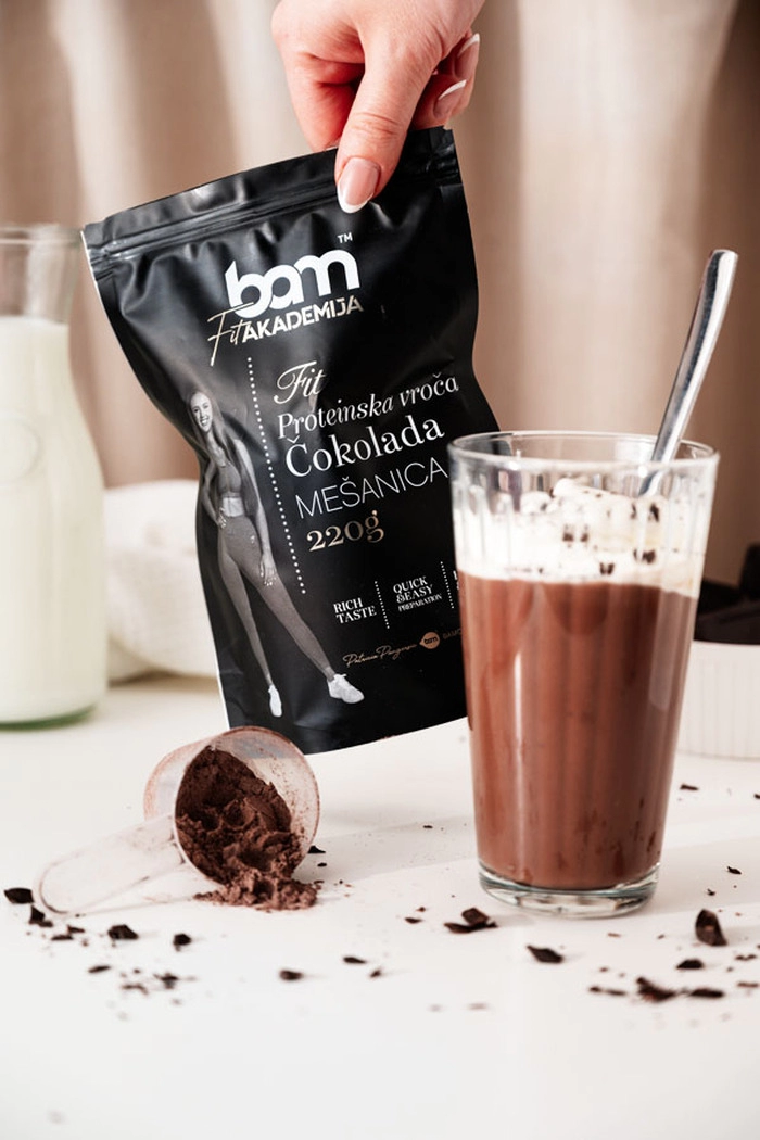 BAM FIT Akademija Proteinska vroča čokolada je idealna izbira za tiste, ki iščete slastno, a hranljivo poslastico. V prahu za pripravo vroče čokolade je dodana posebna mešanica sirotkinih proteinov, ki se brez težav zlijejo s čokoladnim okusom, pri čemer napitek ohranja gladko teksturo brez grudic. Proteini zagotavljajo dodatno hranljivost napitka.