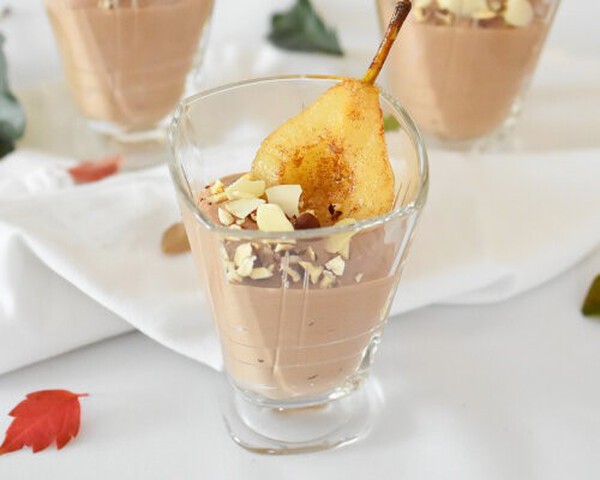 Čokoladni mousse s hruško je odlična sladica, ki jo lahko postrežete tudi v kozarcu. Tokrat čokoladni mousse pripravimo s hruškami. Začinjene hruške s čokoladno kremo so idealna sladica za jesen in zimo. Med kuhanjem hrušk, dodamo tudi cimet in rum. Vonj cimeta in ruma odišavi ves prostor ter pričara tisto praznično, posebno vzdušje, pa čeprav ga še do malo prej ni bilo. Kako šele mora biti v kombinaciji s čokolado in praženimi lešniki? Pravljično.