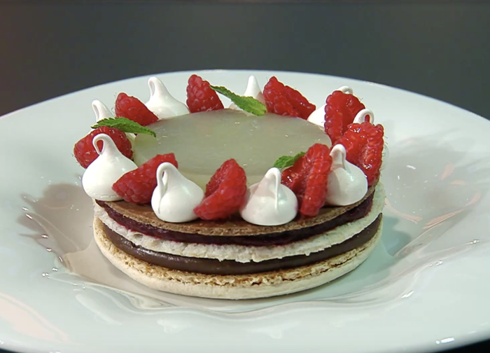 Sladica je okrašena z meringo, koščki malin in mete. Vsaka komponenta Karimove sladice je skrbno izbrana in pripravljena z namenom, da se dopolnjuje z ostalimi, kar ustvarja nepozabno kulinarično izkušnjo. Sledite receptu in osupnite svoje goste.