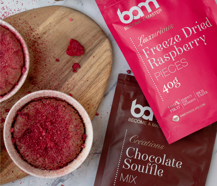 Malinov-čokoladni soufflé je sladica, ki navduši s svojo lahno teksturo, medtem ko okus malin doda prijetno svežino. Ta soufflé je prava poslastica za vse, ki imajo radi uravnoteženost med sladkim in kislim. BAM Mešanica za čokoladni souffle ti zagotavlja enostavnejšo pripravo sladice. Med peko soufflé naraste v pečici, kar ustvari čudovito penasto strukturo. Maline dodajo svežino in barvni kontrast, ki bo gotovo očaral tvoje goste.