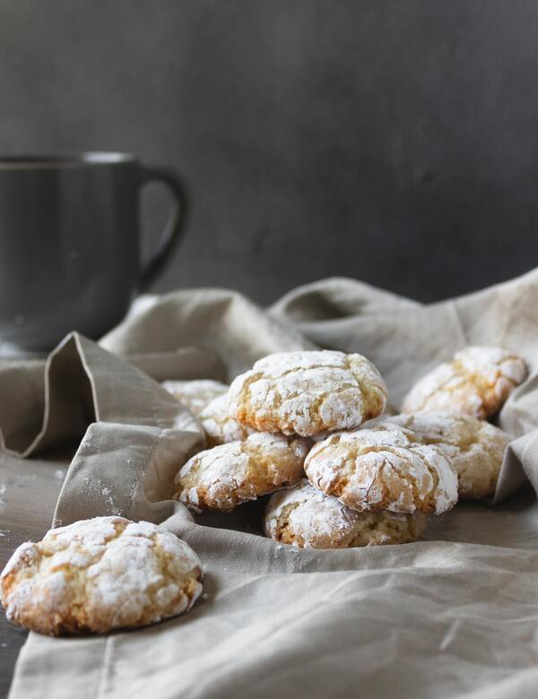 Pečico segrejemo na 200°C. Dva pekača za piškote obložimo s papirjem za peko. V ločeni plitve sklede stresemo granulirani sladkor in sladkor v prahu. Dlani rahlo potresemo s sladkorjem v prahu, da se testo ne oprime rok. Zajamemo približno dve žlici testa za vsak piškot in ga nežno zvaljamo v kepo. Kroglico najprej rahlo povaljamo v kristalnem sladkorju, nato pa močno povaljamo v sladkorju v prahu. Piškote položimo na pekač približno 2 cm narazen, saj se bodo med peko razlezli. Ponovimo s preostalim delom testa.