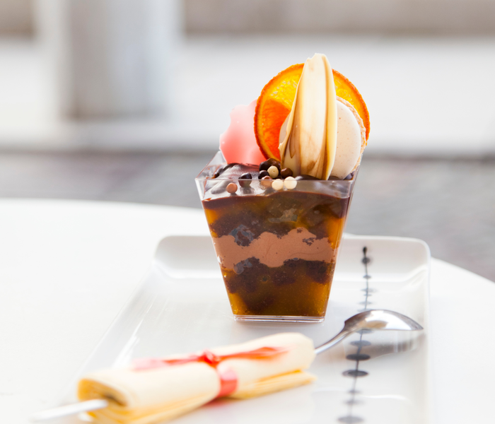 Biskvit narežite na kocke ali z uporabo kozarca izrežite kroge, ki se prilegajo vašim kozarčkom. V vsak kozarček na dno položite plast biskvita. Na biskvit dodajte plast BAM FIT Akademija marelične marmelade. Ponovite plasti, dokler ne napolnite kozarčkov. Zaključite z vrhnjo plastjo stepene smetane. Na vrh dodajte koščke temne čokolade ali naribano čokolado.