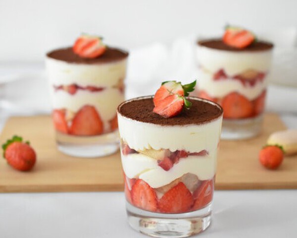 Na dno kozarcev razporedimo 2 žlički nasekljanih jagod. Dresirno vrečko z večjim okroglim nastavkom napolnimo s kremo in nabrizgamo v kozarce, da pokrijemo jagode. Po dve polovički piškotov na hitro pomočimo v raztopino in položimo na kremo. Rahlo potisnemo. Nabrizgamo kremo, dodamo žličko jagod in ponovimo postopek s piškoti. Po piškotih razdelimo ostanek kreme in jo z žličko poravnamo. Smetano stepemo s sladkorjem v prahu in kozarce napolnimo do vrha. S paletnim nožem potegnemo čez kozarec, da odstranimo višek smetane in dobimo gladko površino. Posipamo s kakavom in ohladimo.